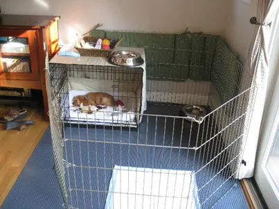 This specific set up gives the puppy the benefit of having their own small and cozy den, enough space to move around, the opportunity to soil only in one area and not in the entire house and the sense of feeling more free and relaxed.
